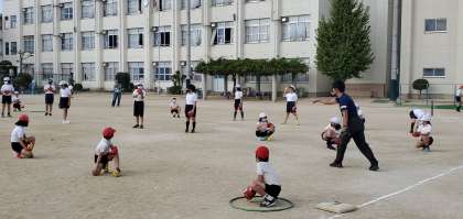 午後は4年3組と4組がティーベースボールを教えていただきました(1・2組は10月9日が雨天だったため、講堂で台上前転を教えていただきました)。