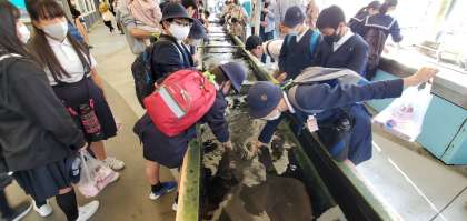 タッチプールで、アカエイを触ろうとがんばっている様子です(笑)
