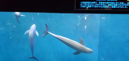 上の写真が小さな鯨のなかまのスナメリ。愛嬌のある顔をしています。