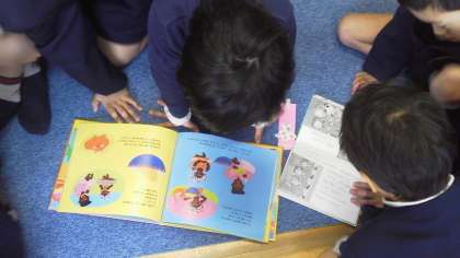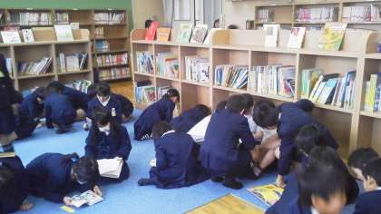 金曜の昼休みは、図書館ボランティア ミルパジュの皆さんによる図書館開放があります。たくさんの子どもたちが、図書館にやって来て楽しそうに読書していました。