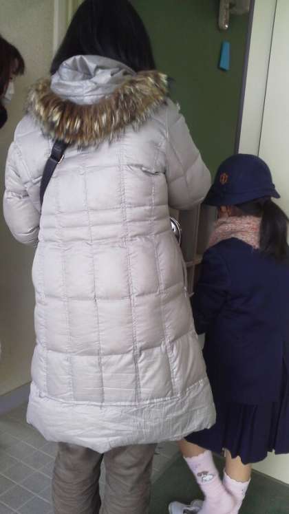 講堂を出た保護者は、子どもの分団の教室に向かいます。分団教室では、保護者が子どもの学年と名前を告げ、担当職員が分団名簿をチェックし子どもを引き渡します。