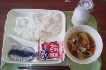 今日は節分です。メニューは、いわしのしょうがじょうゆかけ、含め煮、いり大豆、ごはん、牛乳です。