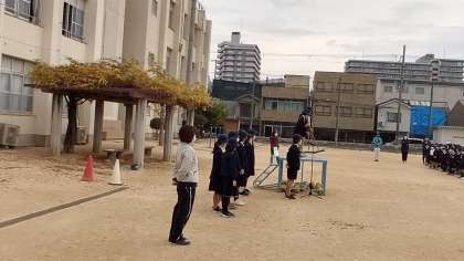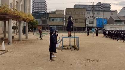 本日の児童朝会で美化委員の児童たちが、掃除の道具の使い方について話をしました。