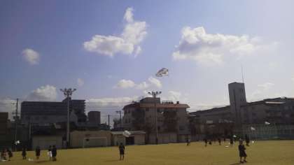 運動場に白い凧があがっています。1年生が生活科でぐにゃぐにゃ凧をあげているのです。白い凧にお正月らしい絵を描き、凧糸を取り付け、凧上げにチャレンジ!広い運動場を走り回りながら、楽しそうに取り組んでいます。糸がからむと、二人で根気よくほどいていました。凧上げや先日紹介したかるたなど伝統的な遊びを学級の友達と共に生活科で体験してその良さを実感したり、教えあい助け合ったりと貴重な学びになったようです。
