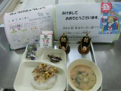 今日のメニューは「れんこんのちらしずし、ぞう煮(花型のラッキーにんじん入り)、ごまめ(全て年1回)、牛乳」でした。