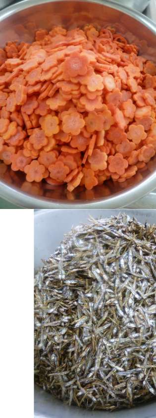 カタクチイワシの幼魚を素干しにしたもの。「五万米」、「五真米」等表記される。「田作り」とも言われるのは、イワシが豊漁で余ったものを田の肥料にしたところ米が豊作となったことから。給食に「ごまめ」が初登場したのは1987年で、35回目の登場となりました。