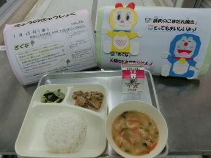 今日のメニューは「豚肉のごまだれ焼き(年2回)、みそ汁、きくなとはくさいのおひたし(年1回)、ごはん、牛乳」でした。