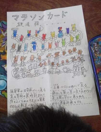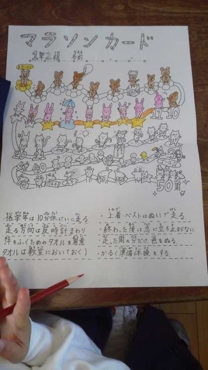 今日もといっても寒いですが、1時間終了後の10分休憩に、低学年児童がマラソンに挑戦しました。授業が終わると「マラソンだ!」と嬉しそうに上着を脱いで運動場に向かいました。走り終わって、がんばりカードに何周走ったかを記録します。寒さに負けず、とっても楽しそうに走っています!