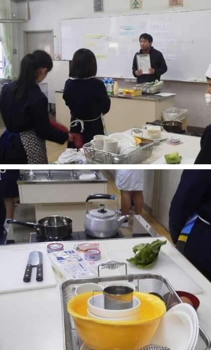 6年生が、小学校生活最後の家庭科調理実習に取り組んでいます。 サンドイッチ作りです。はじめに、作り方や注意点の確認がありました。使う材料や道具は共通です。さあ、手をよく洗って、調理実習スタートです。