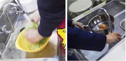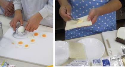 普段から調理に親しんでいる子は手際よく取り組んでいます。あまり経験がない子も班で相談しながら、一生懸命取り組んでいました。