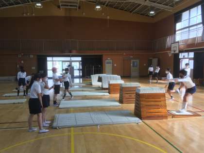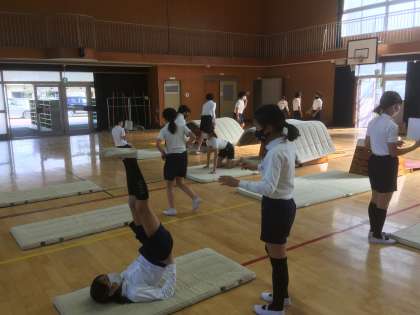 今日の5時間目、講堂で6年生の体育科(器械運動)の公開授業が行われました。新学習指導要領において位置付けられた「はね跳び」の練習方法や補助の仕方等について学びました。