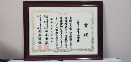 本年度、高倉小学校が、よい歯・口の保持ならびに健康増進にがんばったという事で賞状をいただきました。個人でもらう賞状も嬉しいものですが、こうして学校にいただく賞状もまた違った喜びがあります。