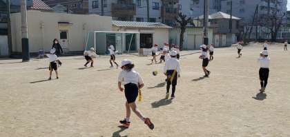 1年生が「タグとり鬼」をしている様子です。ご覧いただいているように、腰に付けたタグを相手に取られないように、玉やボールをゴールまで運べば得点になるというゲームです。このゲームが中・高学年の「タグラグビー」につながっていきます。