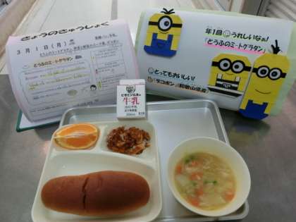 今日のメニューは「とうふのミ−トグラタン(年1回)、押し麦と野菜のスープ煮(年1回)、デコポン(年3回)、黒糖パン、牛乳」でした。