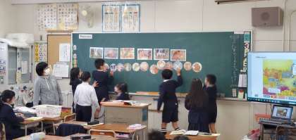 写真は今日の3時間目、3年生が英語の学習をしている様子です。2チームに分かれて両端から動物の名前を英語で言いなら進みます。出会ったところでじゃんけんをし、勝ったら進めるというゲームをしています。