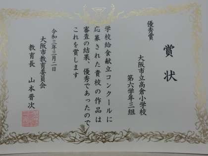 高倉小学校の6年生は、『大阪市 学校給食献立コンク−ル』(クラス単位で応募)に今年度もチャレンジしました。昨年度の6年生に引き続き、今年度の6年生も「優秀賞」に輝きました。大阪市内の小学校から113点の応募があり、最優秀賞は1点、優秀賞は5点が入賞という難関の中、高倉小学校6年3組が受賞しました。