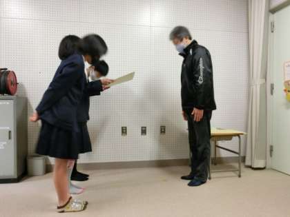 3/8(月)の児童朝会(雨天のためテレビ放送)で、校長先生より全校のみなさんに紹介され、各教室にいる全児童から大きな拍手を受け、健闘が称えられました。