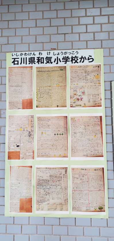 本校では戦時中、高倉小学校の児童の疎開先であった石川県和気小学校との交流をずっと大切にしています。今はそれぞれの児童が調べたことなどを送り合う形で交流活動を行っています。昨日、それが届きましたので早速玄関に掲示しました。