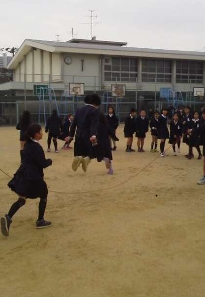 2時間目後の15分休憩に運動場で、学級単位で大縄の「八の字」を跳び、運動委員会児童が数を数えます。規定以上跳べた学級には賞状が贈られるとのことです。