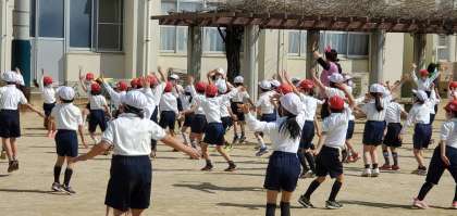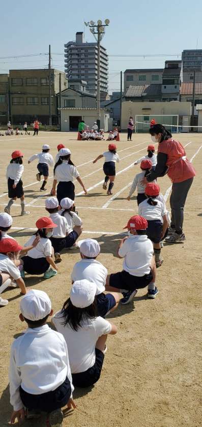 今日の2時間目、1年生が4クラス合同でダンスやかけっこ、玉入れなどを楽しみました。はじめに担任の先生が、応援レンジャーに扮して登場すると、子どもたちから大きな歓声があがっていました。