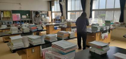 今日は職員作業日に設定しました。4月にスムーズなスタートが切れるよう、図書館の本を整理したり、パソコンを使う環境を整えたり、教科書の準備をしたりしています。