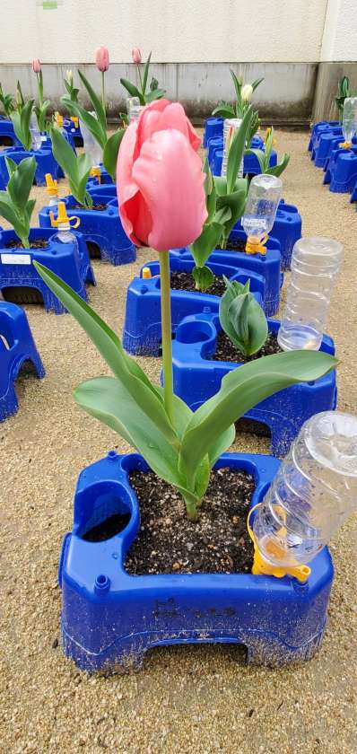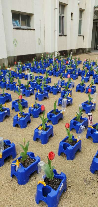 今朝、中庭の様子を見てみると、1年生の子どもたちが大切に育ててきたチューリップが花を咲かせはじめていました。もちろんそれぞれに育つスピードに違いがあり、まだ蕾のものもたくさんありますが、これからもっともっと学校を華やかに彩ってくれることでしょう。