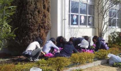 2月27日午前、PTA環境緑化委員会の皆さんによる花壇の植え込みが行われました。今回は、PTA花壇デザインコンクールの最優秀賞、優秀賞を元にしたデザインです。パンジーやサクラ草、アリッサムなど美しい春の花の苗を植えこんでくださっています。どんな花壇になるかは、次回お知らせします。お楽しみに!