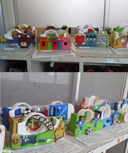 最後は、6年生のセロテープカッターです。思い思いのアイデアで、とっても楽しい作品になっています。電動のこぎりも使い、細かいところも工夫して仕上げています。
