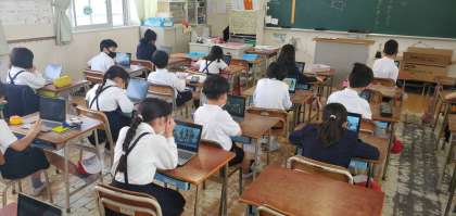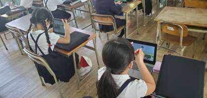 ご覧いただいている写真は今日の1時間目。2年生が動画を選んで視聴しています。2年生はまだアルファベットも習っていないので、パスワードの入力等にも苦戦する子どももいますが、友達同士教え合いながら学んでいます。