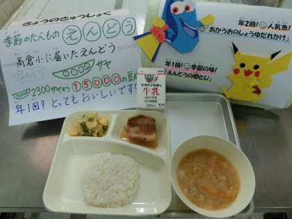 今日のメニューは「あかうおのしょうゆだれかけ(年2回)、みそ汁、えんどうの卵とじ(年1回 卵除去食も調理)、ごはん、牛乳」でした。