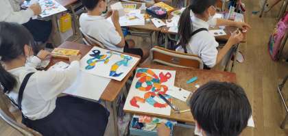 3年生が色の作り方を工夫しながら、「カラフルなへび」を描いている様子です。どの作品も丁寧に描き込むことができていて、色とりどりの可愛らしいへびに仕上がりました。