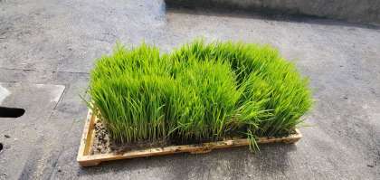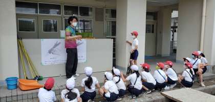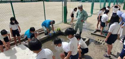今日の午前中、5年生が田植えをしました。最初に担任の先生の説明を聞いた後、管理作業員さんに手伝ってもらいながら、一人一人苗を植えていきました。