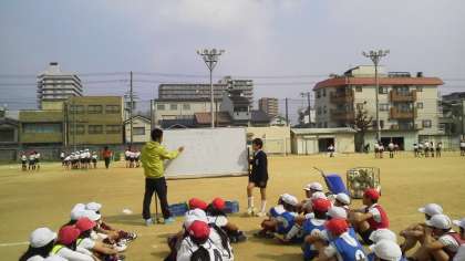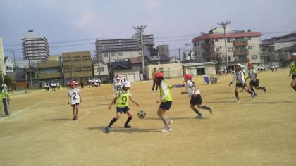 ウオーミングアップの後、自分のポジションを意識して守ったり攻めたりする今日のめあてについて全体で話し合いました。そして、チームごとに相談しゲームを始めます。