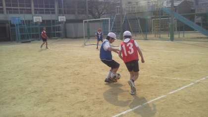 3分区切りで、ゴールキーパーを交替しながら、ゲームを行いました。授業の最後に先攻撃や守りで工夫できていたところを確認し、整理体操を行い終わりました。