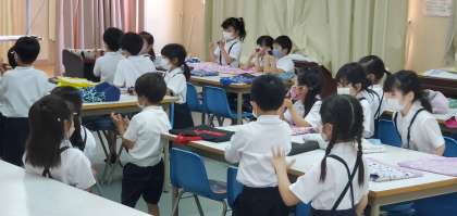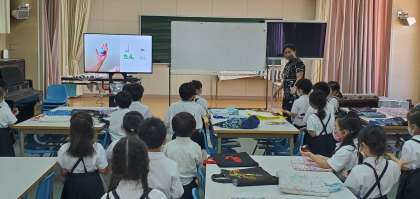 今日、第2音楽室で1年生がカスタネットを使ってリズム打ちの勉強をしていました。ドラえもんの曲に合わせてとっても楽しそうに演奏することができていました。