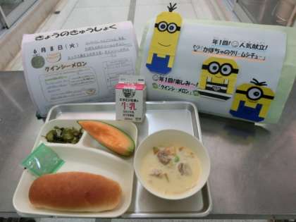 今日のメニューは「かぼちゃのクリームシチュ−(年1回)、ミックス海そうのサラダ、クインシーメロン(年1回)、コッペパン、りんごジャム、牛乳」でした。