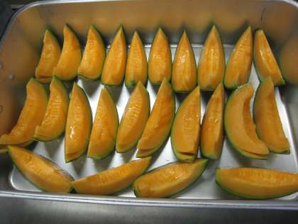 クインシーメロンは1/8にカットし、848切れの種を取り除き子どもたちの所へ!給食では2002年に初登場し、今年で20回目になります。