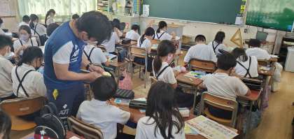 写真は今日の5時間目、5年生が裁縫の学習をしている様子です。裁縫の練習用の布を使って、玉結びや玉止めなどの仕方を勉強しました。