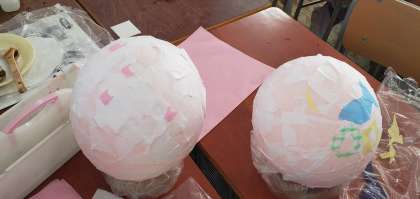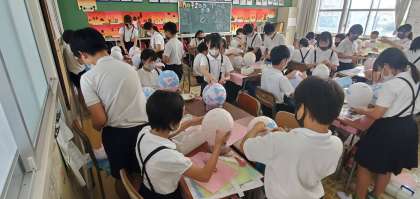今日の4時間目、6年生の図工の時間の様子です。風船に和紙を貼り付けて、オリジナルの明かりを作っていました。どんな作品に仕上がるのかとても楽しみです。