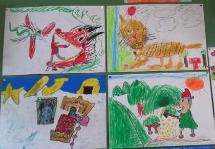 上の段「ほしになった りゅうの きば」「小さな ねこ」下の段「歯がぬけたらどうするの」「花さかじい」です。絵本の世界を自分風にアレンジして表現できていますね。このような学習を通して、読書が大好きな児童を育てていきたいと願っています。