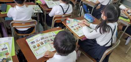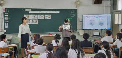 今日の5時間目、5年生の教室で英語の公開授業が行われました。今日は教育委員会の英語授業力向上推進チームの先生にもお越しいただき、授業の良かった点や改善点等についてご指導いただきました。子どもたちがノリノリで英語の歌を歌ったり、ジェスチャーをしたりしていて見ていても楽しい授業でした。