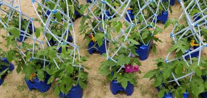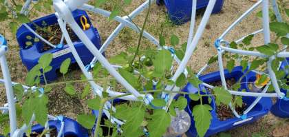 上から1年生が育てているアサガオ、2年生が育てているミニトマト、そして5年生が育てている稲の様子です。