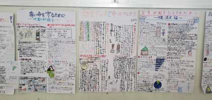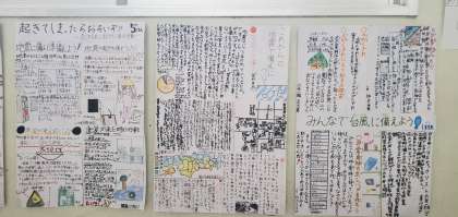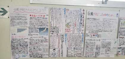 少し見にくくて申し訳ありません。ご覧の写真は6年生が地震や台風等、災害について調べたことを、壁新聞の形でまとめたものです。