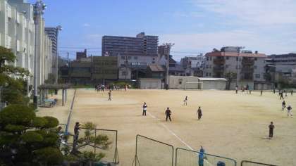 高倉地域では、4月に こども会のソフトボール大会、キックベース大会が開かれます。今日は、青空のもと、校庭でソフトボールやキックベーボールの練習をしています。