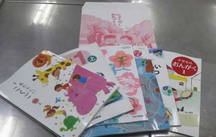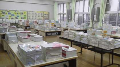 入学式や始業式に備え、新しい教科書が届いています。本年度から教科書が少しリニューアルしています。明日の入学式でお渡しする新一年生用の教科書とお祝いの袋です。