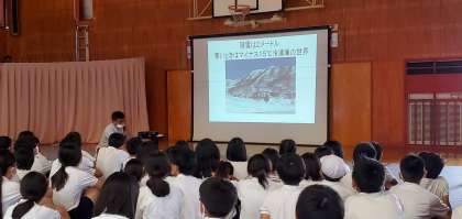午後1時、避難訓練の前に、体育館で宿舎の方からハチ高原のことや部屋の使い方等について説明していただきました。