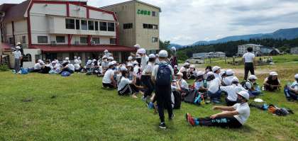 午前11時15分、宿舎前に到着し、スポーツドリンクをいただいています。みんなよくがんばりました。
