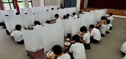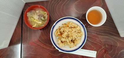 林間学習最後の食事は五目ご飯とお味噌汁です。この後閉舍式を行い、宿舎前の広場で少し遊んでから帰校する予定です。