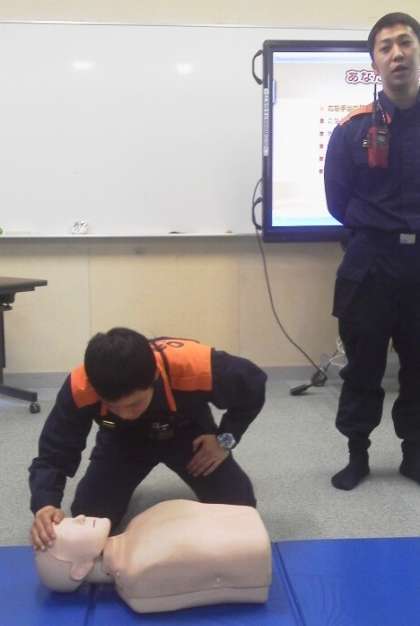 4月22日(水)放課後、6月より始まる水泳指導に備え、救急救命研修会を実施しました。都島消防署の救急隊や消火隊の方に来ていただき、水泳指導を担当する教員が研修を受けました。DVDで、救急車が到着するまでの救命措置の大切さを確認した後、消火隊の方が、心臓マッサージや人工呼吸、AEDの使い方などの見本を示してくださいました。