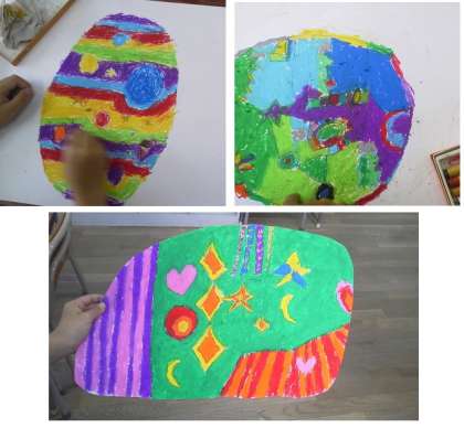 子どもたちは、そんなふしぎなたまごを画用紙にクレパスを使って描きます。